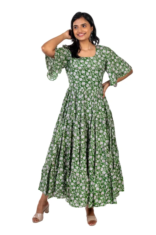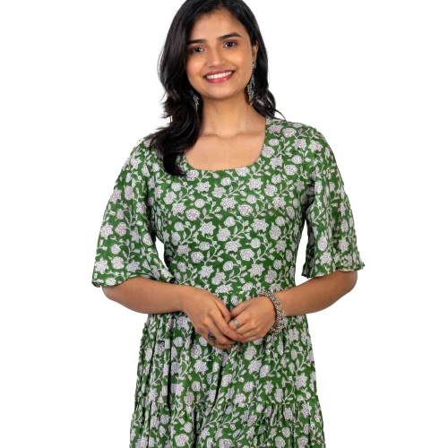Women Green Muslin Floral Printed Flared Maxi Kurti with Bell Sleeves Elegant Long One Piece With Lining for Ladies