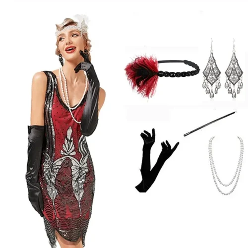 Women Sexy Sequin Tassel Casual Dress 1920s Great Gatsby Costume Accessories Set Evething Club Mini Party Dress