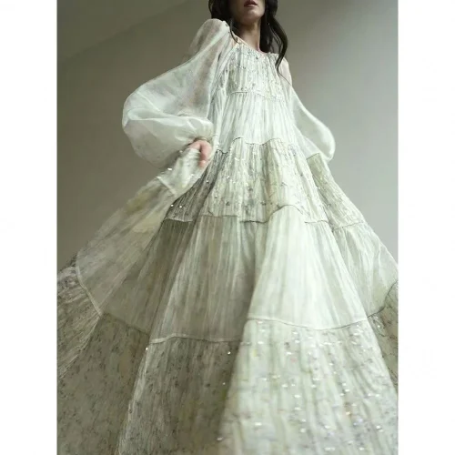Women Spring Summer Midi Casual Dress Ethereal Mint Green Tiered Sequined Embellishments With Long Sleeve Cape Coat