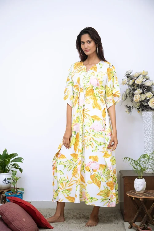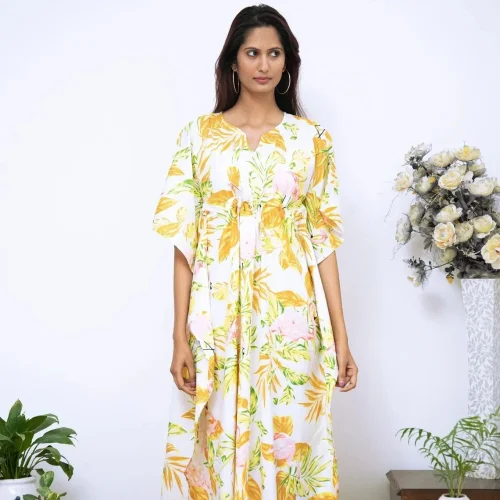 Women’s Lemon Printed Floral Kaftan for Summer Wear Free Size up to Plus Size 100% Cotton with Lace Decoration