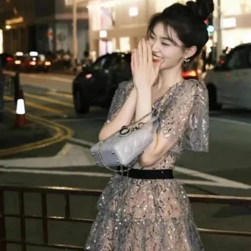 Women’s New Casual V-neck Slim Transparent Short-Sleeved Long Dress Evening Dresses