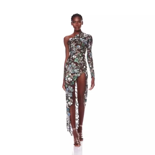 Women’s Sexy Mesh See-Through Slanted Shoulder Asymmetrical Dress Embroidered Tube Top Sequined Elegant Evening Dress