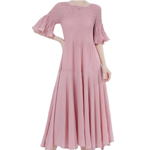 Women’s Short Sleeve High Waisted Pleated Dress Summer Breathable Solid Color Miyake Dress Woven Weaving Method
