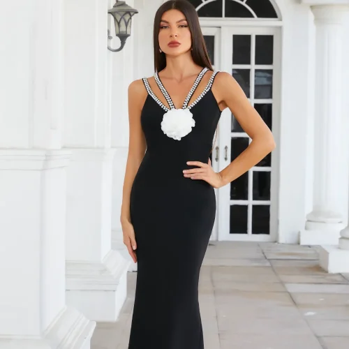 Women’s Sexy V-Neck Splicing Backless Evening Dress New Diamond Encrusted Dress with Straps Casual Style