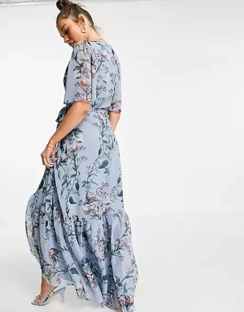 Women’s Sexy Casual Overlapping Flair Sleeve Summer Clothing Long Sleeve Powder Blue Floral Print Dresses
