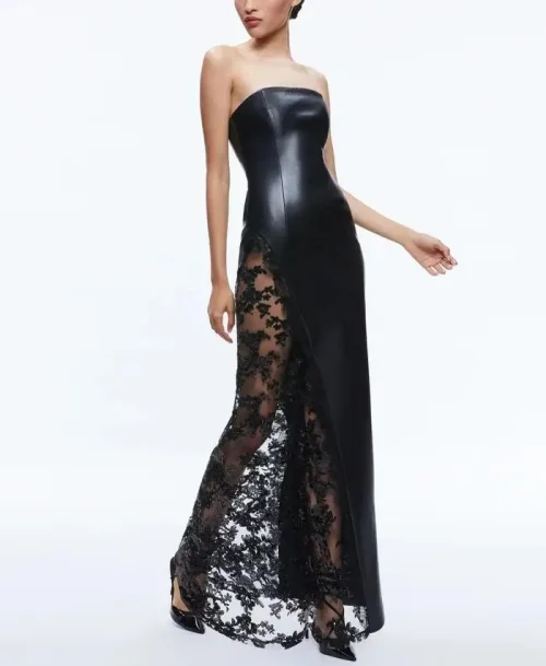 Women’s Sexy Strapless Sleeveless Backless Maxi Dress Lace Artificial Leather Solid Pattern Natural Waistline Nonwoven Weaving