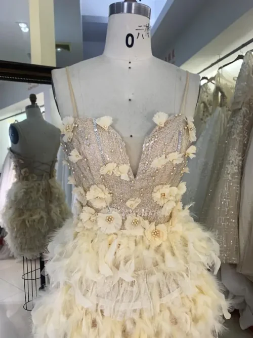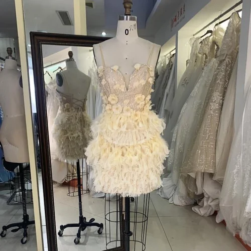 Yellow Feather 3D Flower Spaghetti Strap Homecoming Short Dress for Girls