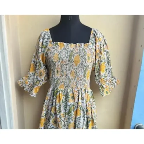 Yellow flowers Boho dress short Block Print Indian Tunics Hand Dress Cotton Long Gown Indian Printed Dress