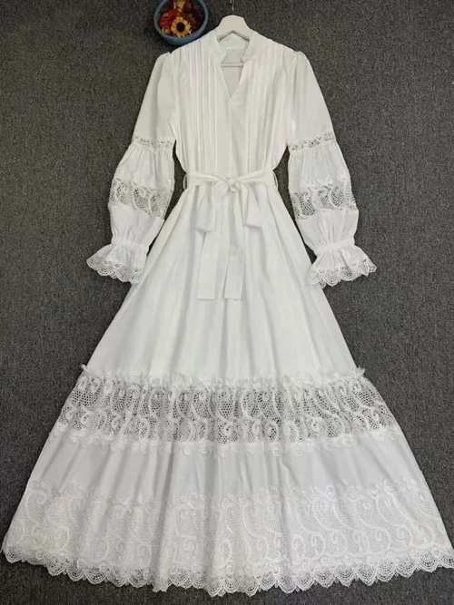 YC Women’s Vintage Solid V-Neck Midi Dress Designer Fashion Lace Hollow-out Lantern Sleeves Flower Casual Back Maxi Party