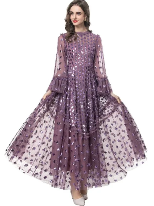 YC Women’s O-Neck Flare Sleeve Sequins Embroidery Mesh Purple Ball Gown Long Dresses Fashion Spring New