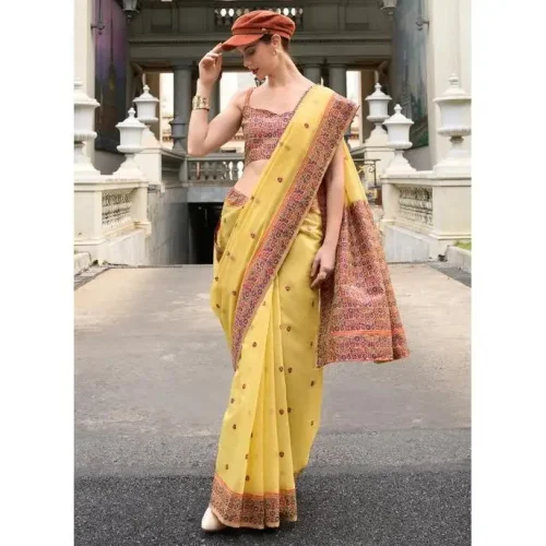 Yellow Linen Cotton Saree Printed Casual Dresses Soft Comfortable Wear