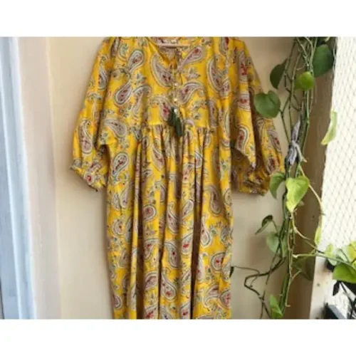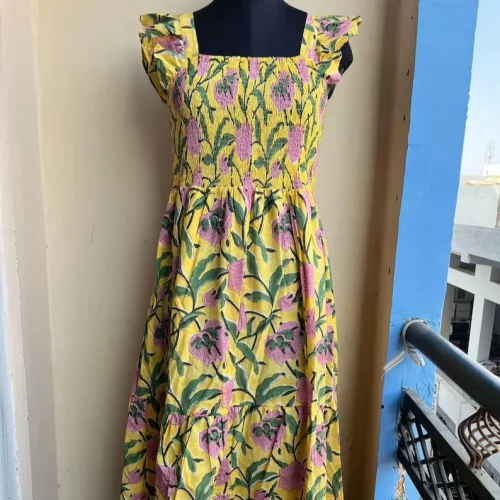 yellow Hand Block Printed Dress Block Print Indian Tunics Hand Dress Indian Cotton Long Gown Indian Printed Dress