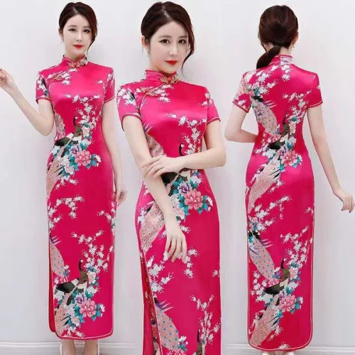 ZJ30-Vintage Floral Qipao Faux Silk Elegant Chinese Dresses Short Sleeves Long Plus Size Slim Cheongsam S-6XL