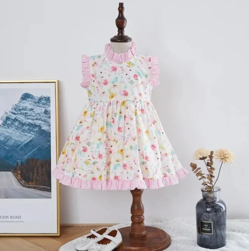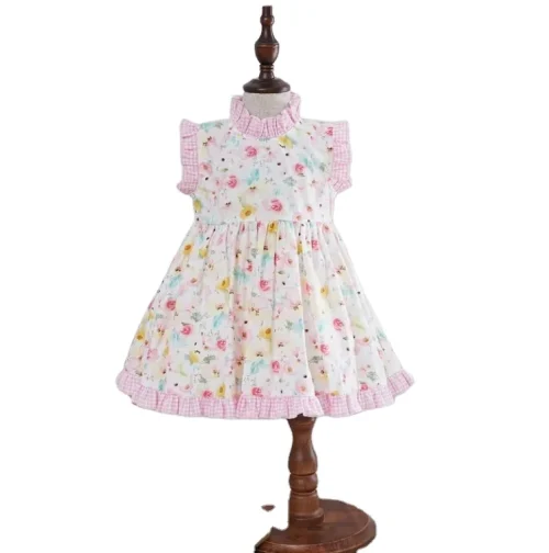 100% Woven Cotton Flutter Sleeves Floral Midi Dress for Girls Summer Casual Button up Ruffles Dress Baby’s Clothes