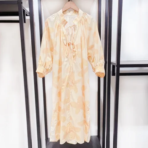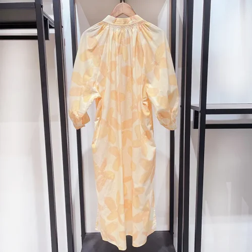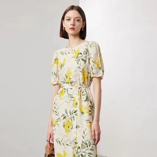 100%Cotton Casual Dress 2022 Summer Fashion Style Women Yellow Floral Prints Bow Deco Half Sleeve Mid-Calf Length Loose Dress