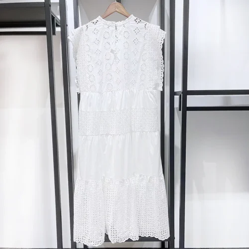 100%Cotton Dress 2022 Summer Style Women Hollow Out Embroidery Patchwork Sleeveless Mid-Calf Length Casual Loose White Dress