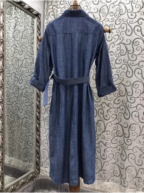 100%Cotton Dress 2024 Autumn Style Women Turn-down Collar Elegant Floral Print Pocket Patchwork 3/4 Sleeve Midi Blue Jeans Dress