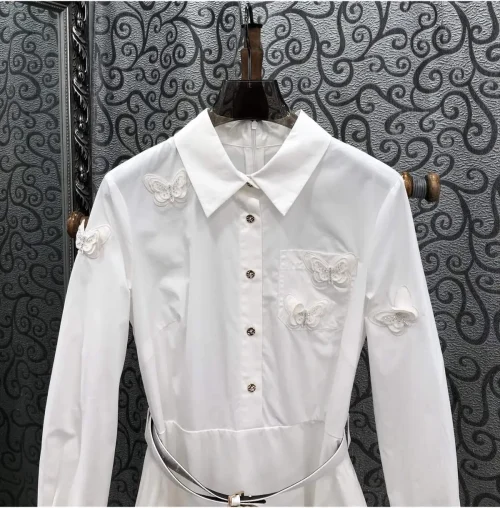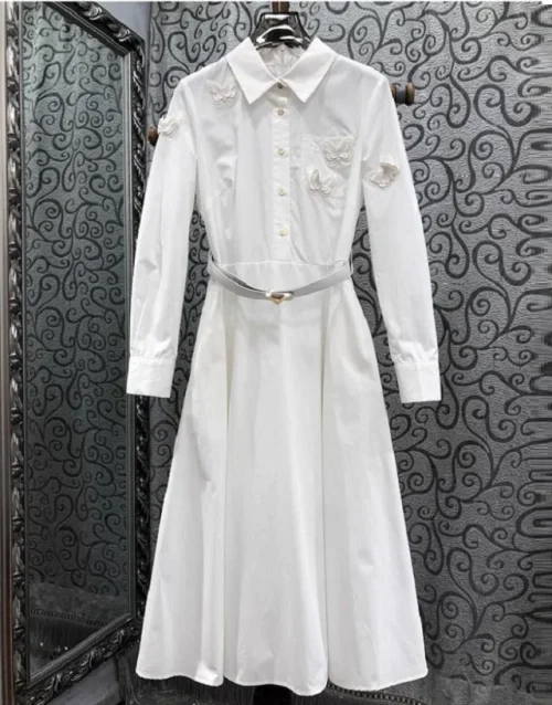 100%Cotton Dress 2024 Autumn Women Turn-down Collar Butterfly Embroidery Long Sleeve Mid-Calf White Pink Dark Blue Dress Belt