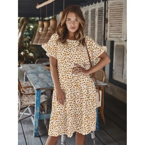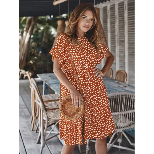 5863-R- Dress Women Casual Dresses Lotus Sleeve Polka Dot Women Ladies Summer