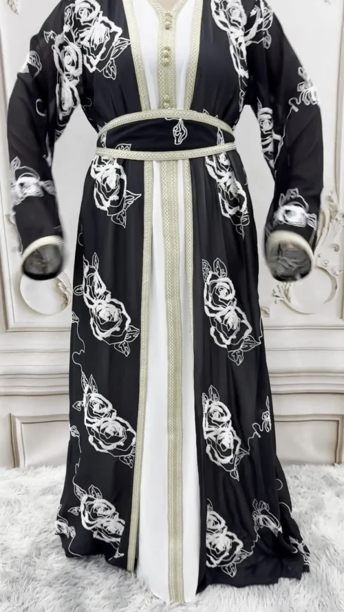 2pcs Middle East Abaya Women Muslim Dress Elegant Floral Printing Evening Dresses Long Sleeves Maxi Dress Ladies Abaya Dubai