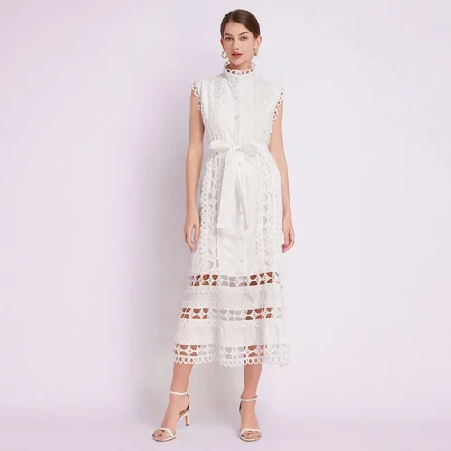 50841 Real S Summer New Women’s Elegant A-Line Dress Vertical Collar Slim Stand Neckline Hollow Lace Casual Career Dress