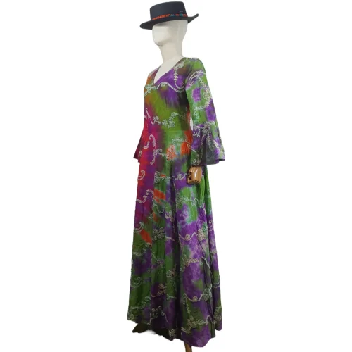 Bohemian Tie-Dye Hand Embroidery Maxi Dress with Bell Sleeves Woven Clothes from Thailand for Vacation Pattern Decor on Back