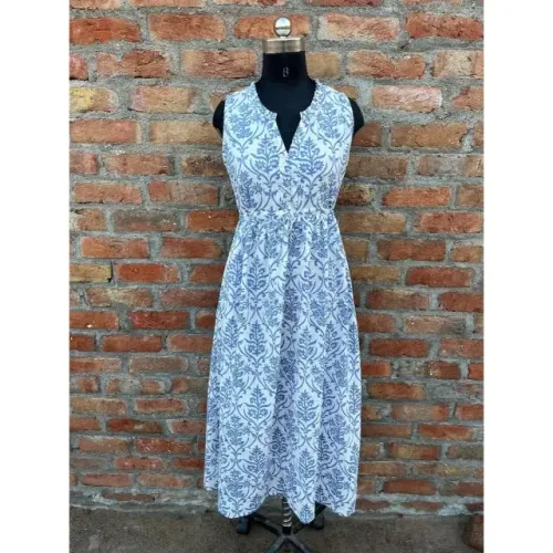 Blue Indian Cotton Long Gown Hand Block Printed Dress Indian Floral Print summer wear women Sleeveless Cotton Summer Dress