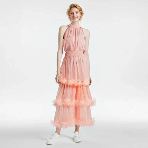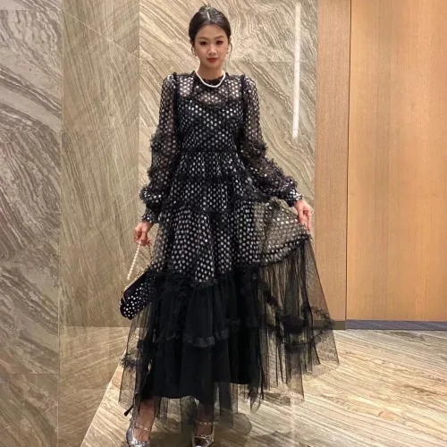 Elegant Ladies Casual Dress Autumn New Sleeveless Waist Tight Cake Design Multi-Level Pleated Mesh Solid Pattern Sexy Ear-rimmed