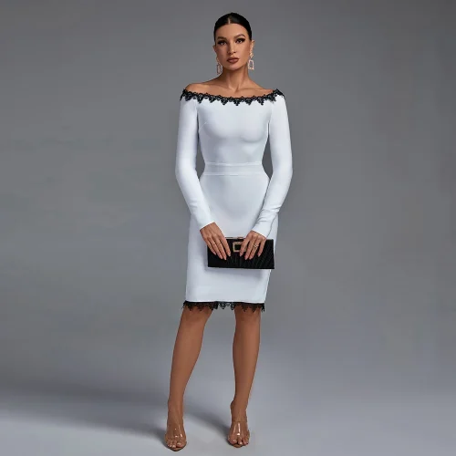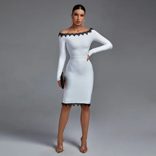 Elegant Summer Vestidos Casuales Commuter Lace Patchwork Sexy Long Sleeve Off Shoulder Dress Lady Bandage Womens Party Dresses
