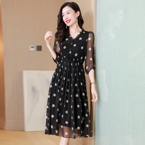 Elegant Summer Silk Dress for Women Freshly Printed MIDI with Lace Decoration Figure-Slim Cinched Waist
