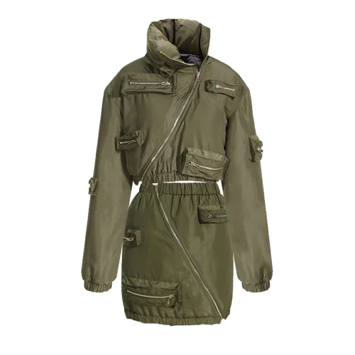 Fall Winter Sexy Casual Zipper 2 Piece Short Crop Cardigan Puffer Coat Jacket With Mini Cargo Skirts Sets Women 2 Piece Outfits