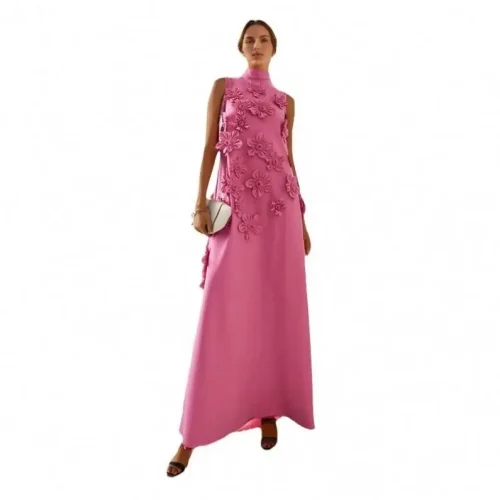European and American Socialite Style Dress 2024 Stand Collar Sleeveless Design Three-Dimensional Flower Long Solid Color Dress
