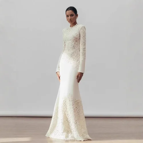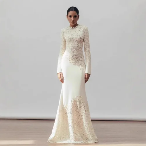 Fashion Luxury High Quality Vintage Elegant Hook Flower Fishtail White Dress 2024 Winter New Tight Banquet Evening Dress
