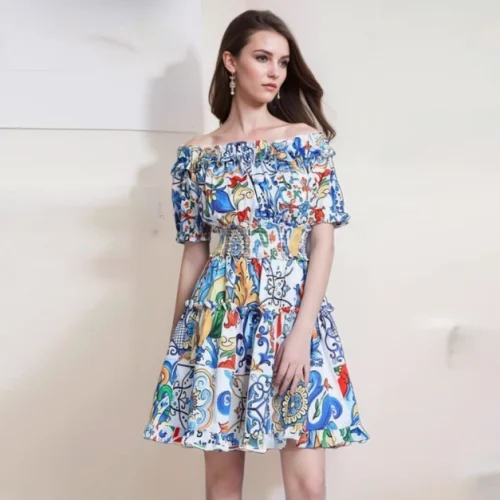 Fashion Casual Short Dress 2025 Spring Women’s Off-Shoulder Short Sleeve Blue and White Porcelain Print Elastic Waist