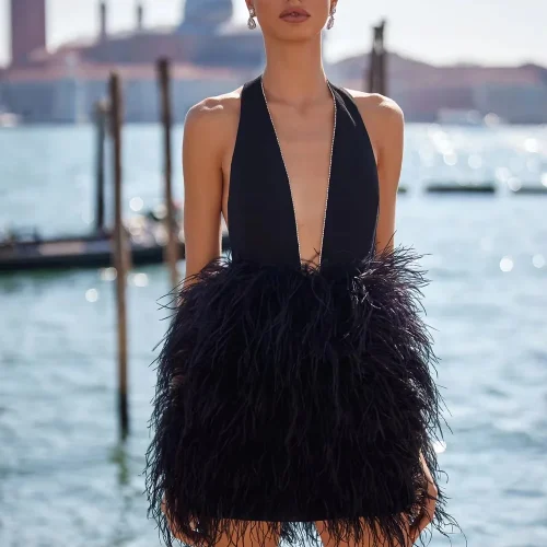 New Fashion Summer Women’s Patchwork Deep V-Neck Feather Hanging Backless Club Short Dress