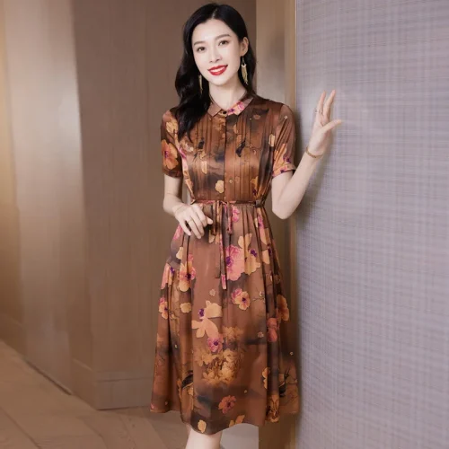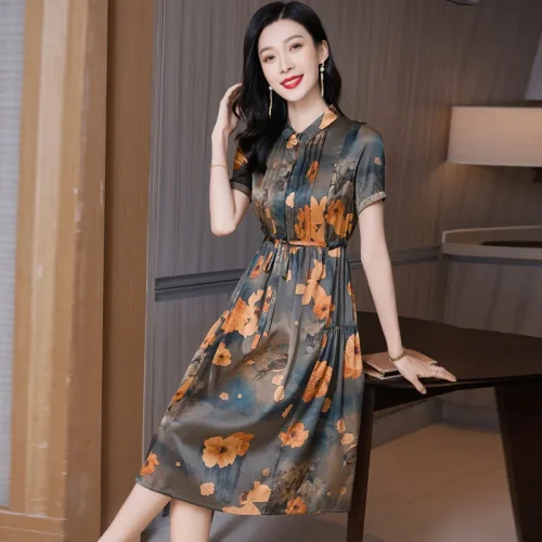 New Retro Floral Printed Silk Dress for Women Casual Style Long Low-Waist with Digital Printing Heavy Washable