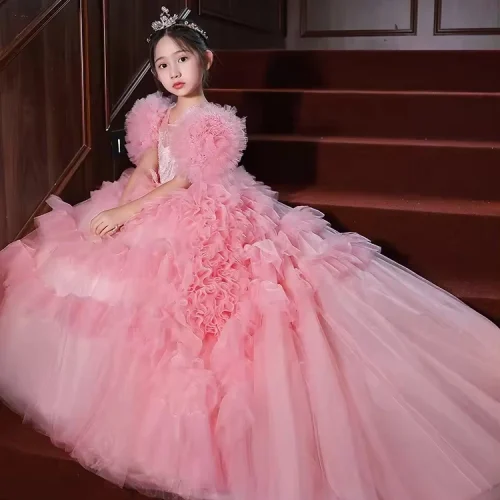 New Pink European Style Children Piano Performance Dress Drag Tail Flower Girl Princess Skirt Model Catwalk Dresses