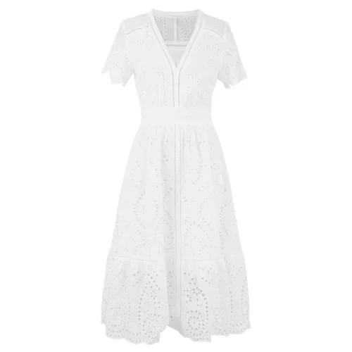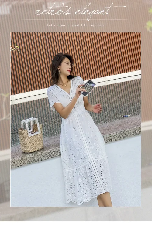 New Korean Fashion Dress 2022 Summer Ladies V-Neck Hollow Out Embroidery Short Sleeve Mid-Calf Length White Dress Boho Beach