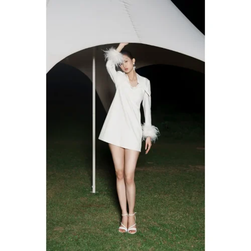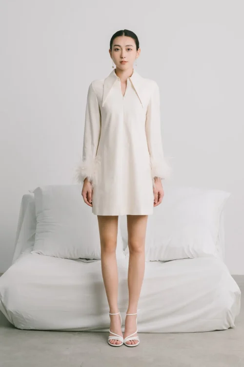 New Style Long Sleeve Short Women’s Dress Front Zipper Feather Cuff ARYM MINI DRESS WITH FEATHERS Floral Cotton Jacquard