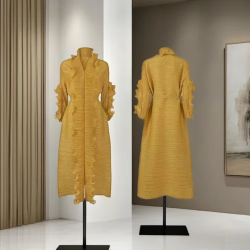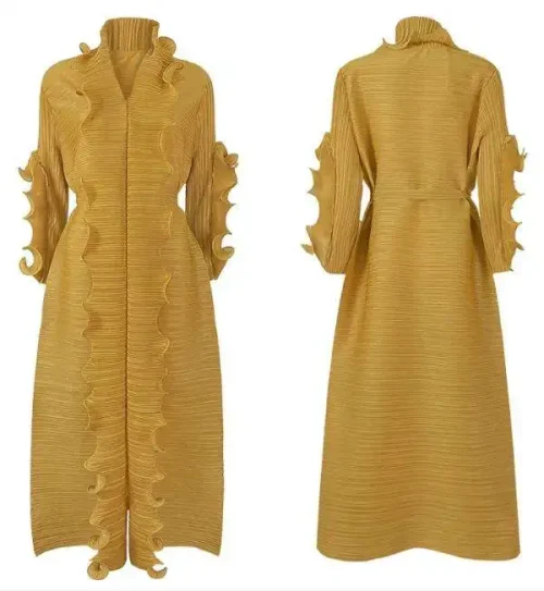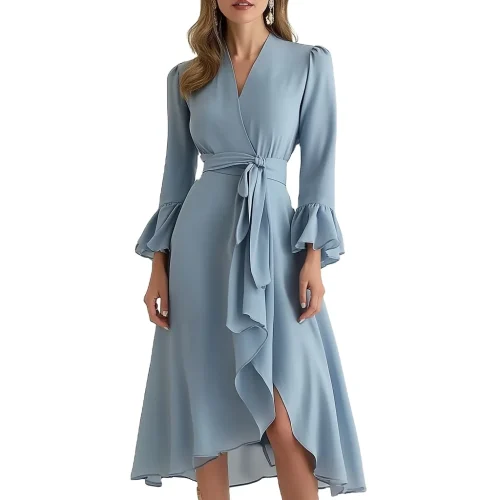 New Style Women Solid Colour Belt Wrapped Blouse Dress Long Sleeve Ruffle Hem Calf-length Woman Casual Midi Dress