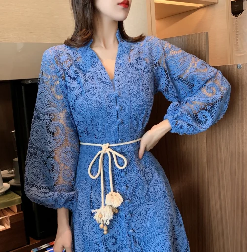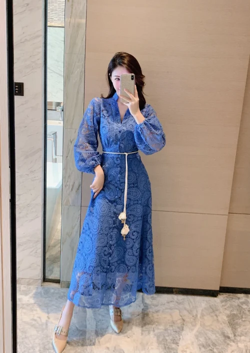 2022 Women Long Lace Hollow-out Lantern Sleeve Dress With Belt Dresses for Women