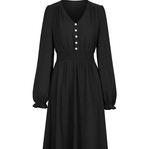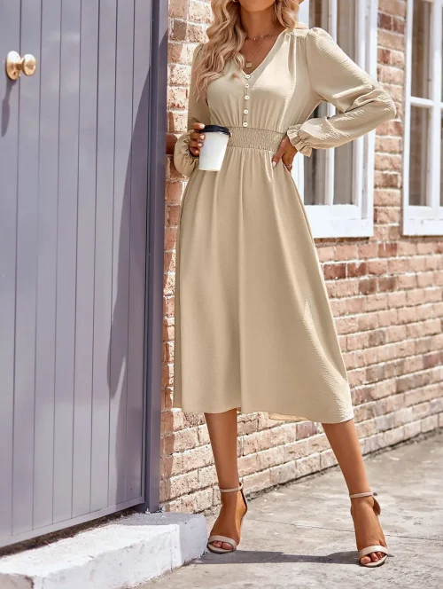 2023 Autumn and Winter New Women’s V-neck Waist Casual Comfortable Solid Color Mid-length Women’s Dress