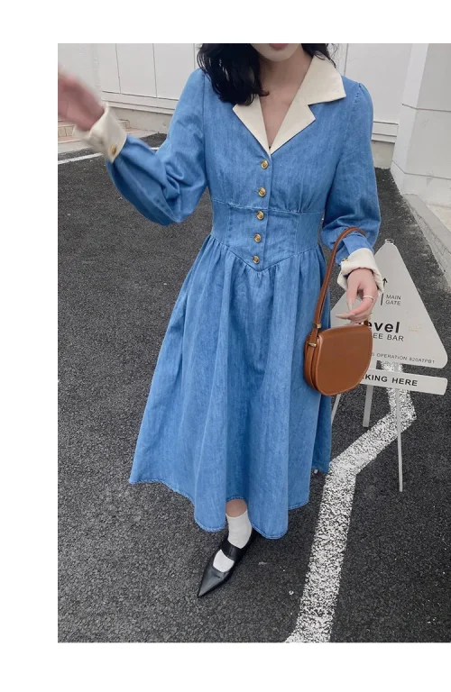 2022 Women’s Vintage Spring Single-breasted Long Sleeve Contract Collar Cuff Sleeve Fit and Flared Casual Denim Midi Dress