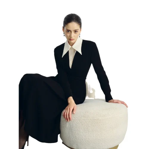WHITE ANT Manufacturer ANDREA MIDI DRESS 100% Polyester Casual Dresses High Quality Long Black Flared Dress With Collar