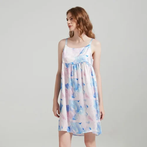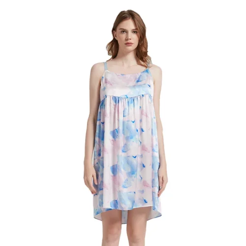 Watercolor Printing Women 100% Pure Silk Night Dress for Sleep