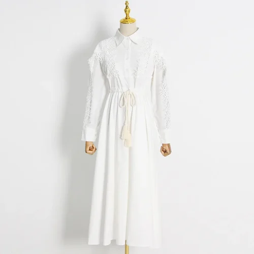 Vestidos Casuales Elegant Shirt Long Dresses Women’s 2022 Autumn New Fashion Lapel Embroidery Hook Flower Waist Dress