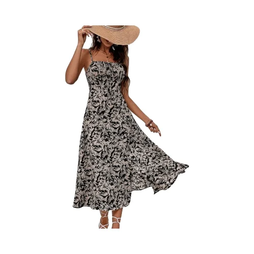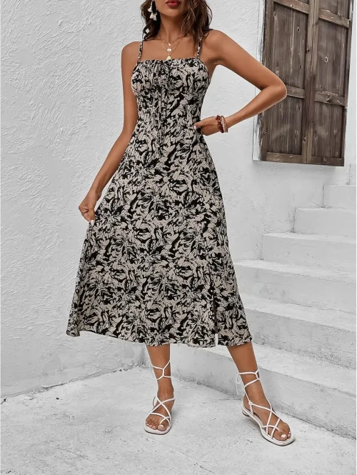 Women’s 2025 Summer Floral Print Midi Dress Square Neck Tie Front Spaghetti Strap Natural Technique Plain Dyed Casual Dresses