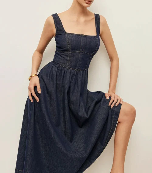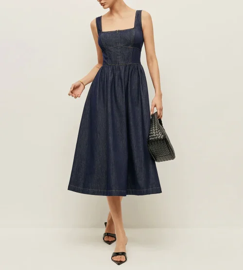 Women’s Blue Denim Maxi Dress Square Neck Button Front Sleeveless A-line Dress Casual Cotton Flowy Sundresses