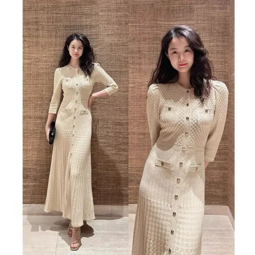 Women’s Casual Maxi Dress with Long Sleeves and O-Neck Button High Quality Anti-Static Knit French Design Slimming Gold Color