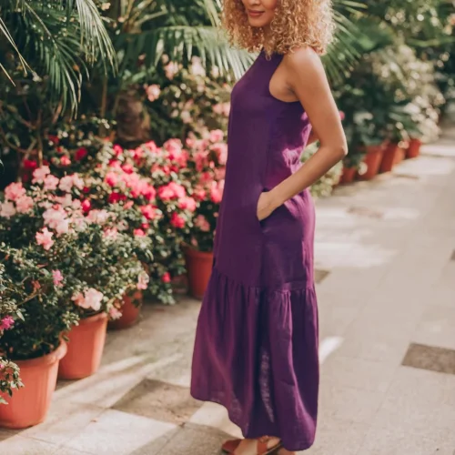 Women’s Purple Linen Summer Midi Dress Sleeveless with Lace Decoration and Pockets Minimalist Tiered Design Plain Dyed
